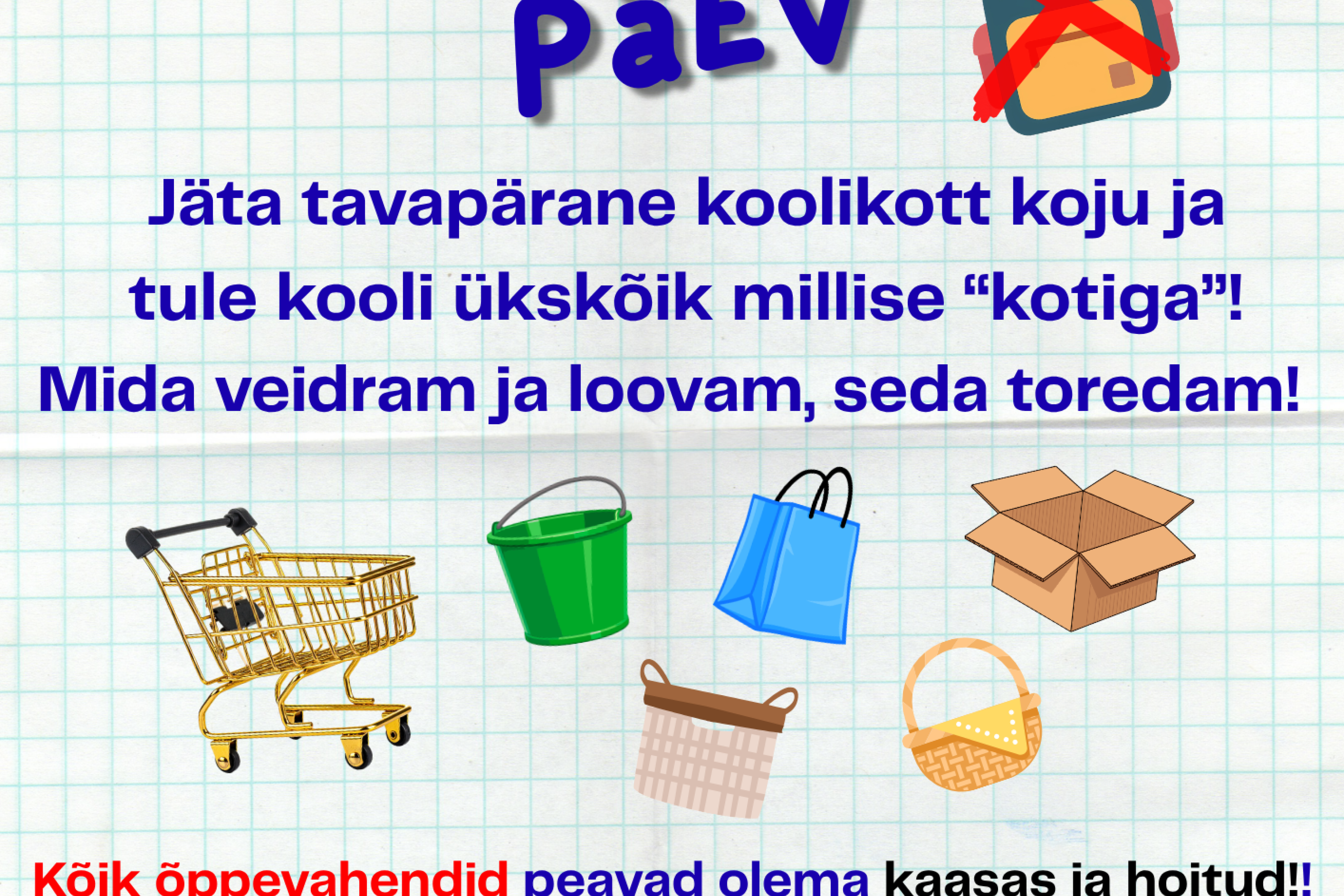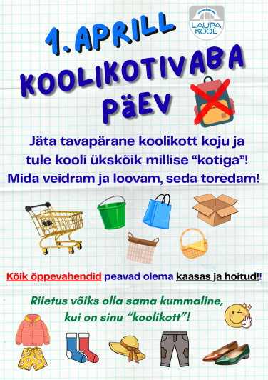 1.aprillil võib jääda igapäevane koolikott koju puhkama. Leia selleks päevaks endale asenduskott, ole loov ja humoorikas, kuid õpikud ja muud õppevahendid peavad olema sealjuures hoitud.